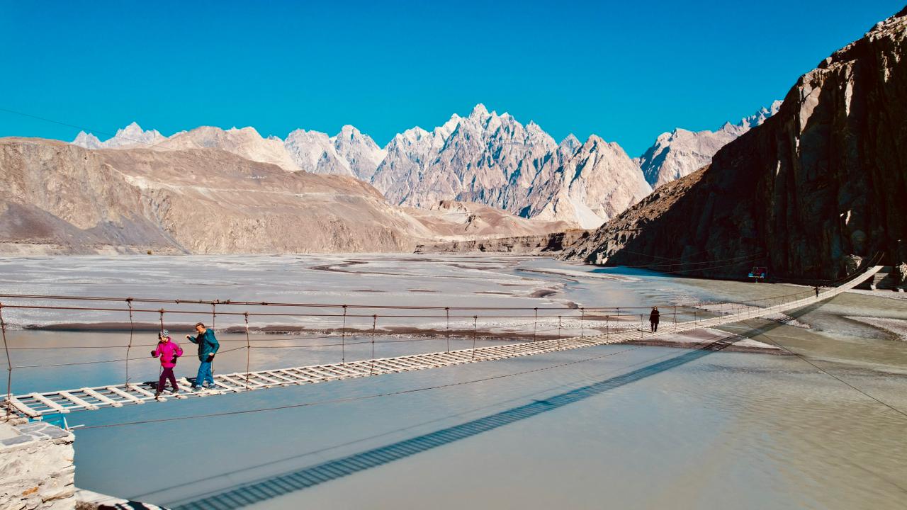 Visit the Altit Fort, a UNESCO World Heritage Site, before departing Karimabad by vehicle to travel up the Hunza Valley along the famous KKH (Karakoram Highway). We pass through picturesque villages nestled in oases dominated by high glacial mountains. We explore Lake Attabad, with its magnificent turquoise waters winding through the valley for over 20 kilometers. We stop at the Gulmit suspension bridge, once the second capital of the Hunza Valley. A short detour takes us to Lake Borith, then a 2-hour round trip climb to a lookout point where we can observe the Passu Glacier. We finally arrive at the village of Passu to spend the night at the hotel. Spectacular sunset over the “Cones of Passu” Dinner at the hotel.